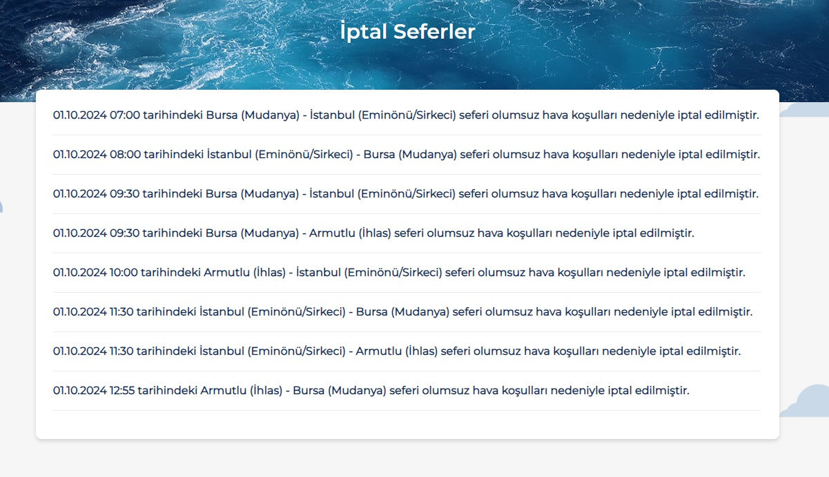 BUDO'dan yapılan duyuruda, 07.00 ile 12.55 saatleri arasında yapılması planlanan Bursa (Mudanya) - İstanbul (Eminönü/Sirkeci), İstanbul (Eminönü/Sirkeci) - Bursa (Mudanya), Bursa (Mudanya) - İstanbul (Eminönü/Sirkeci), Bursa (Mudanya) - Armutlu (İhlas), Armutlu (İhlas) - İstanbul (Eminönü/Sirkeci), İstanbul (Eminönü/Sirkeci) - Bursa (Mudanya), İstanbul (Eminönü/Sirkeci) - Armutlu (İhlas), Armutlu (İhlas) - Bursa (Mudanya) olmak üzere karşılıklı 8 deniz otobüsü seferinin iptal edildiği belirtildi.