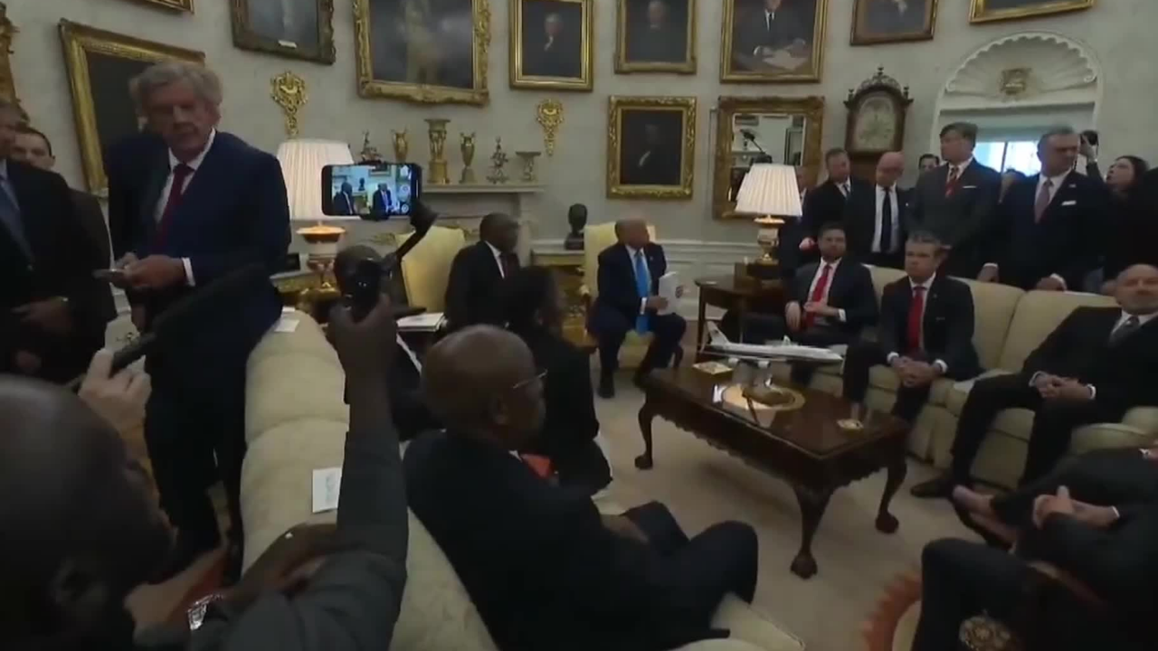 Başkan Donald Trump Çarşamba günü Oval Ofis'te Güney Afrika Devlet Başkanı Cyril Ramaphosa ile basın toplantısı düzenledi. Toplantı sırasında NBC News'ten Peter Alexander, Pentagon'un Çarşamba günü Air Force One olarak kullanılmak üzere 400 milyon dolarlık bir Katar jetini resmi olarak kabul etmesi konusunda Başkan Trump’a soru sordu.