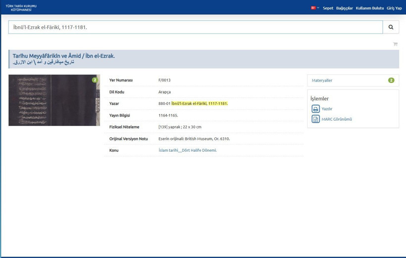 İslam tarihine ışık tutan, 1100'lü yıllarda yazılan İbnü'l-Ezrak el-Fariki'nin 'Tarihu Meyyafarikin ve Amid' isimli kitabının bilinen 3 cildinden 1'inin orijinali, İngiltere’nin başkenti Londra'daki British Museum'da muhafaza ediliyor.