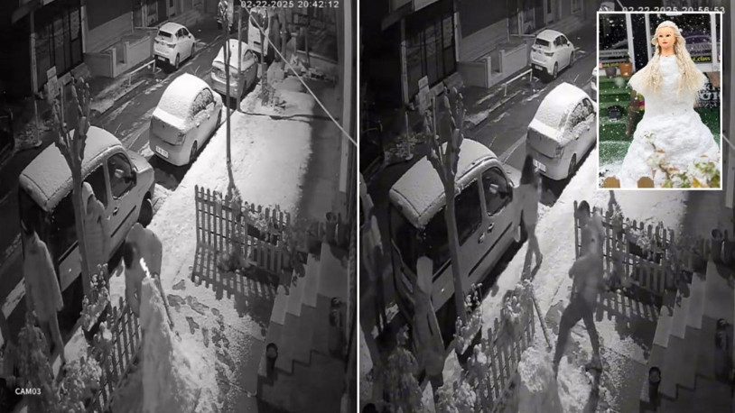 Görenleri gülümseten kardan gelinin plastik gövdesi akşam saatlerinde bir grup tarafından çalındı; kuaför bahçesinde kalan kardan gelinin diğer kısımları ise grup üyeleri tarafından tekmelendi. O anlar güvenlik kamerasına yansıdı.