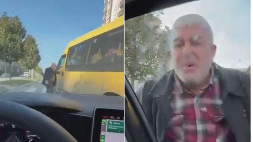 Kadın sürücünün kullandığı cipin kapılarının kilitli olması üzerine cipin camına tüküren minibüs sürücüsü, daha sonra aracına binerek uzaklaştı. Yaşananlar, cipin sürücüsü tarafından cep telefonu ile kaydedildi.