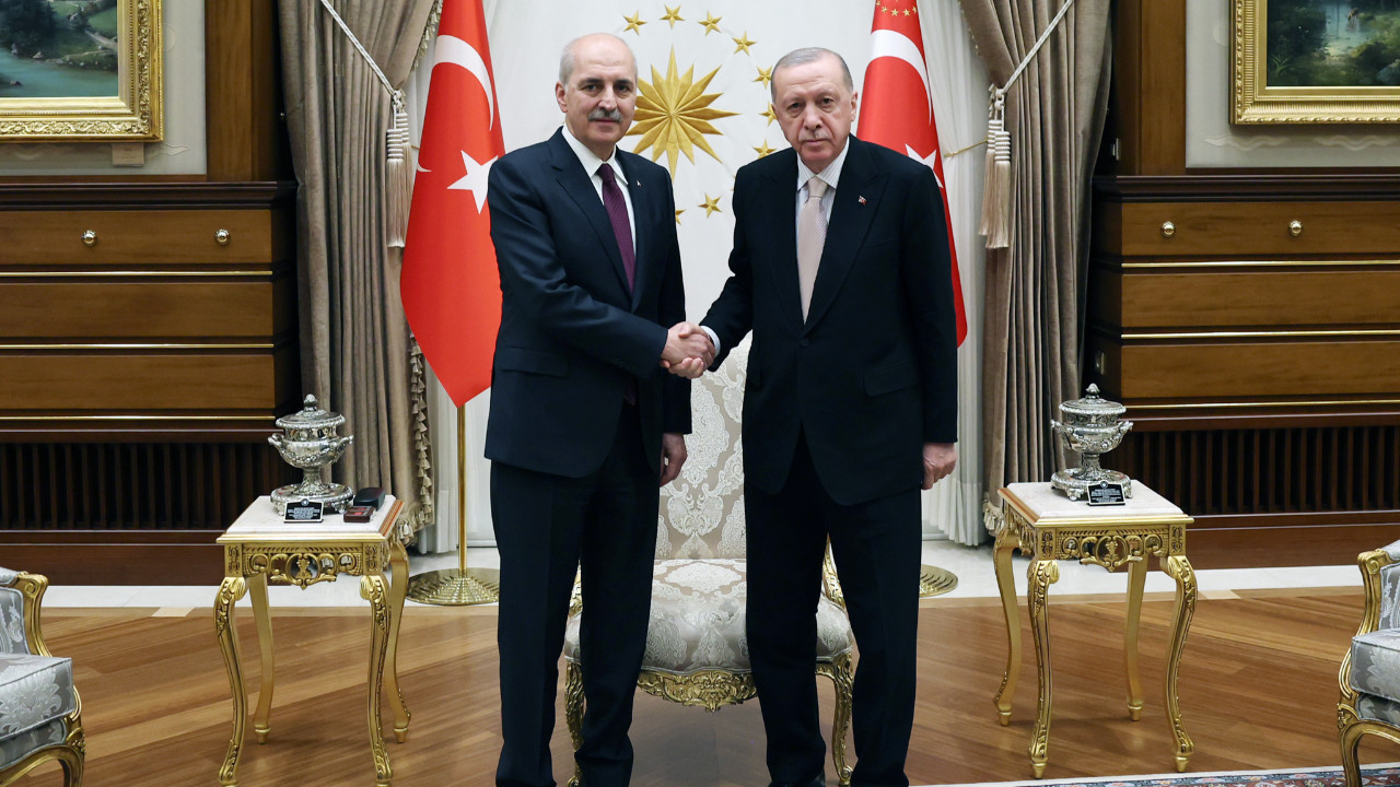 Cumhurbaşkanı Recep Tayyip Erdoğan, TBMM Başkanlığı'na yeniden seçilen Numan Kurtulmuş'u Cumhurbaşkanlığı Külliyesi'nde kabul etti. Basına kapalı gerçekleşen görüşmeye ilişkin fotoğraf paylaşıldı.