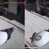 Adamın yolda yürüdüğü sırada çanak anteni görmesi ve antenin adamın omzuna çarparak yere düştüğü anlar çevredeki bir iş yerinin güvenlik kamerasına saniye saniye yansıdı.