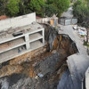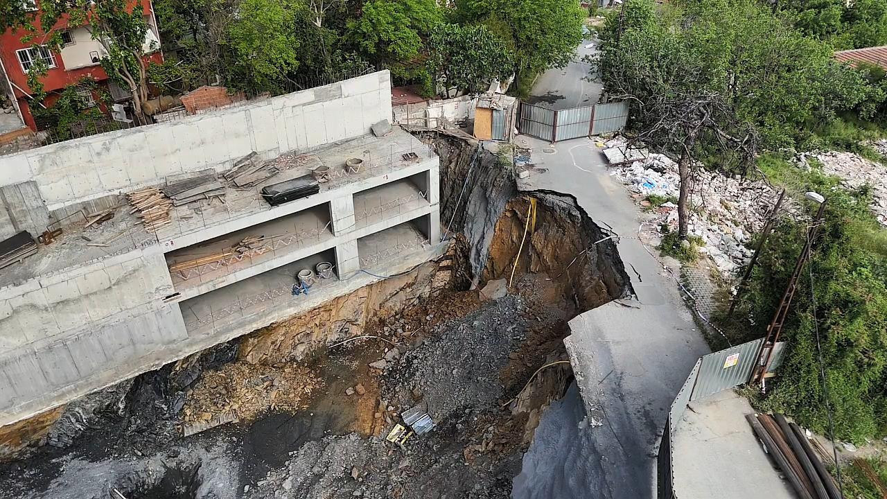 Diğer yandan çöken yol drone ile havadan görüntülendi. Çökmenin meydana gelmesiyle inşaat çalışmalarına da ara verildi. Çöken yolun çevresi ve inşaat alanına doğru kayan toprak drone görüntülerine yansıdı.