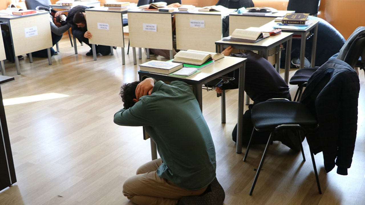 -Okulda sınıfta ya da büroda ise sağlam sıra, masa altlarında ve ya yanında; koridorsa ise duvarın yanına hayat üçgeni oluşturacak şekilde ÇÖK-KAPAN-TUTUN hareketi ile baş ve boyun korunmalıdır.