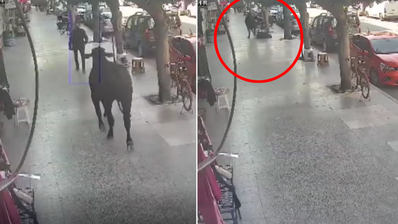 İlçe merkezini birbirine katan angusun, kaldırımda yürüyen kişiyi boynuz darbesiyle yaraladığı anlar ise bir iş yerinin güvenlik kamerasına yansıdı.