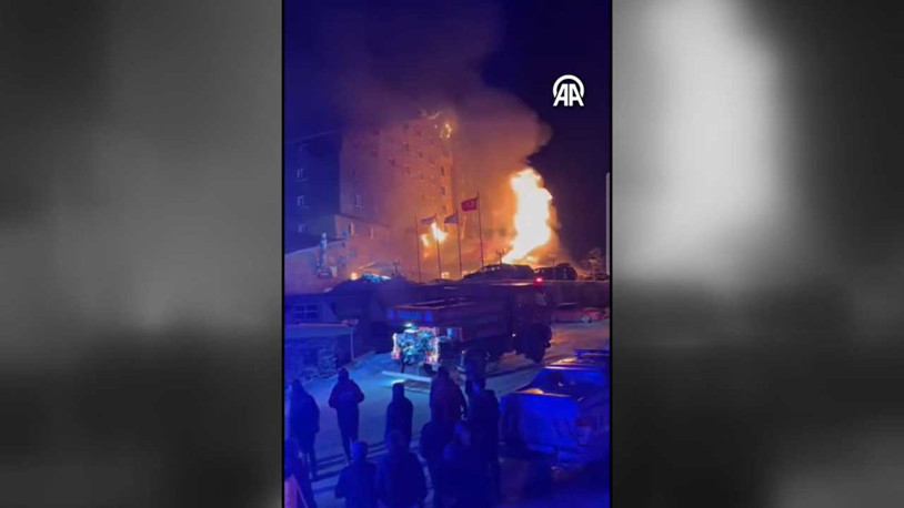 Görüntülerde otelin girişi, vadiye bakan cephesi ve üst katlarından alevler yükseldiği görülüyor.