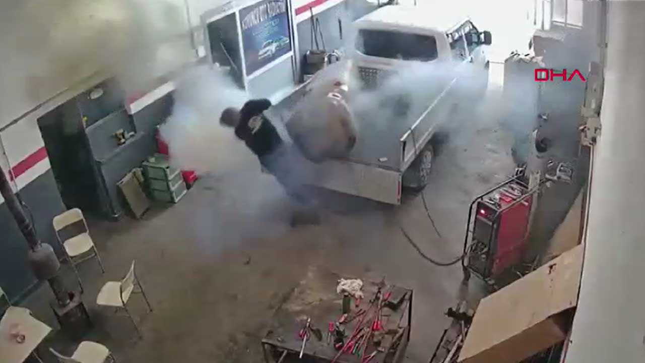 O anlar, iş yerinin güvenlik kamerasına yansıdı. Ortaya çıkan görüntülerde kaynak sırasında patlamanın yaşandığı anlar yer alıyor.