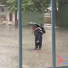 Bir elinde şemsiye, sırtında torunu olan dede, İstiklal Marşı'nın sağanak altında bekleyerek dinledi.