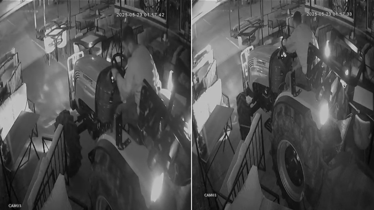 Sabah işletmeye gelen mekan sahipleri, gördükleri manzara karşısında şaşırırken, güvenlik kameralarını izleyince olayın nedeni belirlendi. Görüntülerde, traktör sürücüsünün masa ve sandalyeler arasında gezdiği anlar yer aldı.