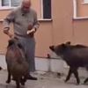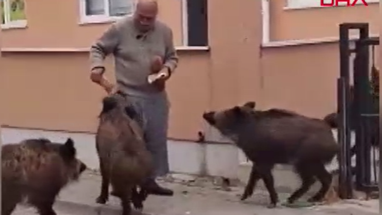 Marmaris'te bir domuz sürüsü Siteler Mahallesi'ne indi. Buradaki bir anaokulunun bahçesine giren domuzlar dolaşarak, yiyecek aradı. Bu sırada bir vatandaş elinde ekmekle gelip, domuzları besleyerek uzaklaştırmak istedi.